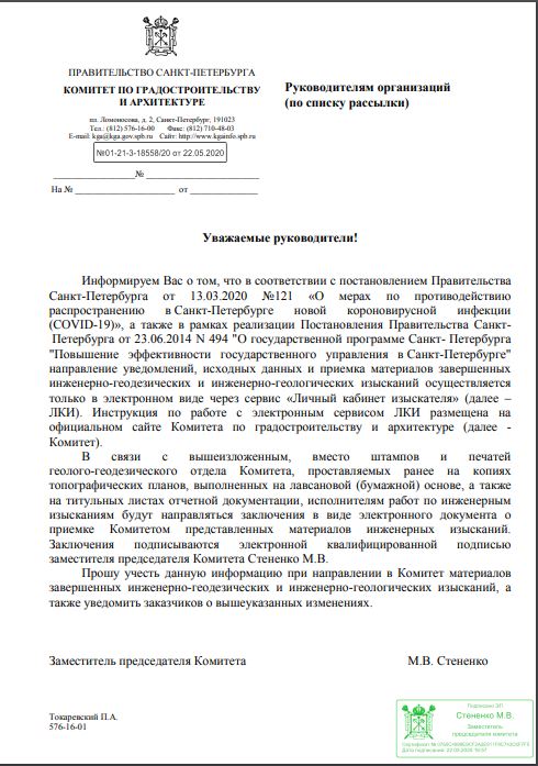 По распоряжению Комитета по градостроительству и архитектуре Санкт-Петербурга № 01-21-3-18558/20 от 22.05.2020 г., геолого-геодезический отдел Комитета больше не будет проставлять штампы и печати о проверке на копиях топографических планов, выполненных на лавсановой бумаге, и титульных листах отчетов по инженерным изысканиям, как было ранее.Теперь исполнителям работ по инженерным изысканиям будут направляться заключения в виде электронного документа о приемке Комитетом материалов инженерных изысканий. Заключения будут подписываться электронной подписью.